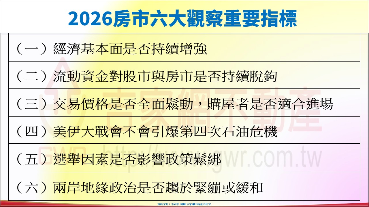 (五)選舉因素是否影響政策鬆綁:2023新青安就是選舉的政策考量,否則政府不會在房市高檔做多,2026面對九合一選擧,在房市低迷狀態下,新青安2.0修正𨒂續極有可能,在交易量被限貸資金鎖喉狀態下,第二戶換屋限貸是否鬆綁,對交易量增加影響很大,選前房產政策值得關注。