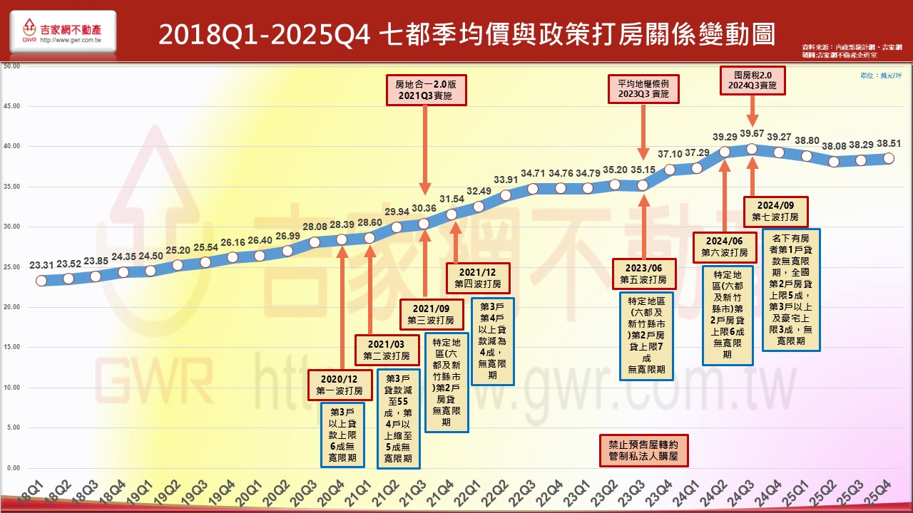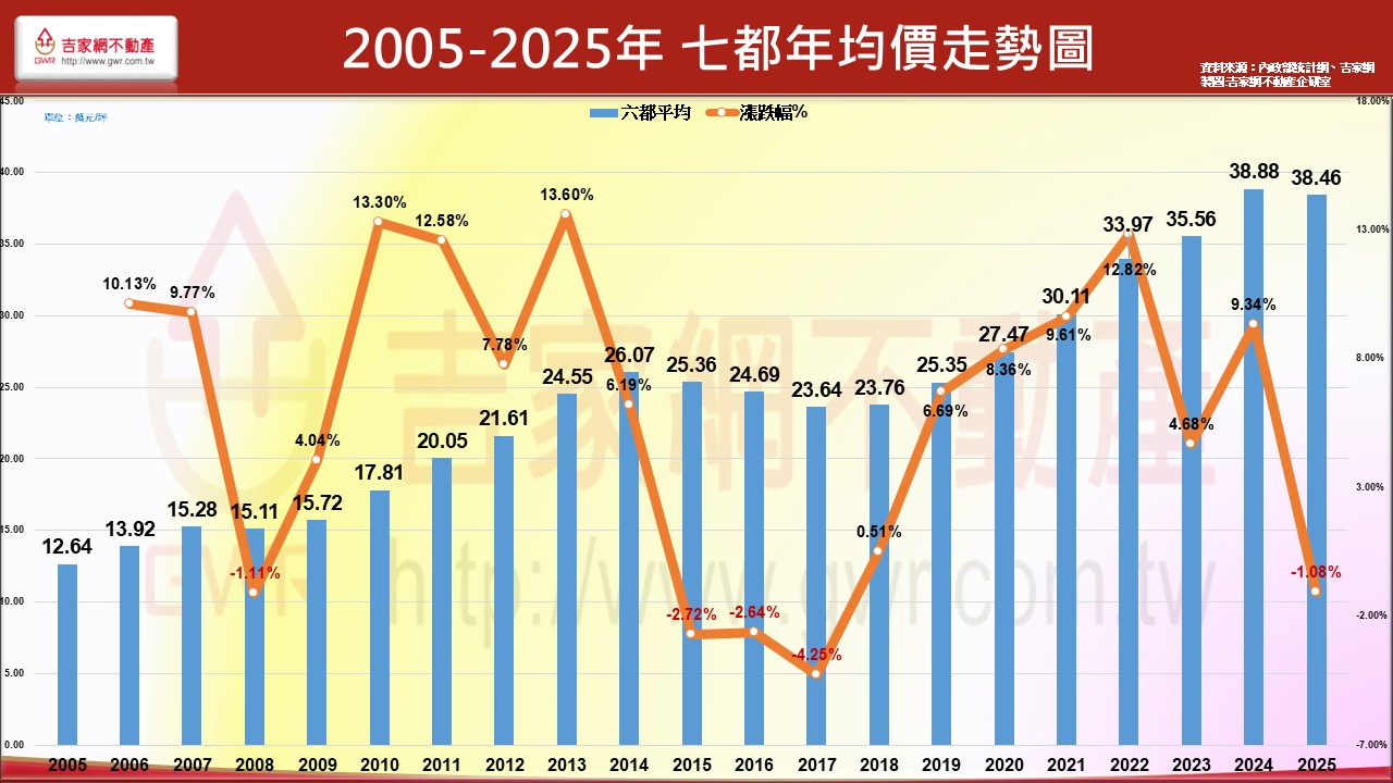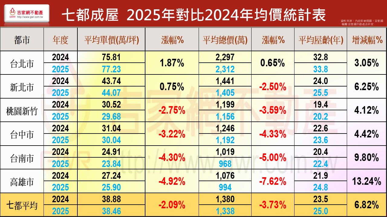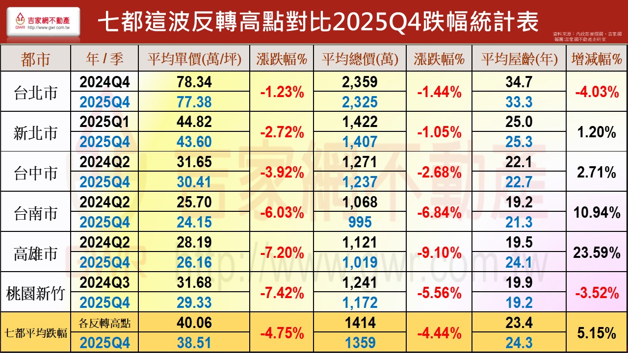 吉家網企劃處長莊文樹分析,2025年全台房市呈現「價小跌、量急凍」現象,七都房價由2024 Q3高點反轉向下跌幅4.75%,若排除2024 Q4已跌部分,2025全年七都平均房價分析,卻只跌2.09%,主要是2025Q4受大量交屋潮影響,單季拉高平均房價,導致掩蓋實質跌幅約2%。上述2025行政區前十大漲幅雙北囊括六名,前十大跌幅雙北囊括五名,特別凸顯雙北地區房市表現強弱分明態勢。