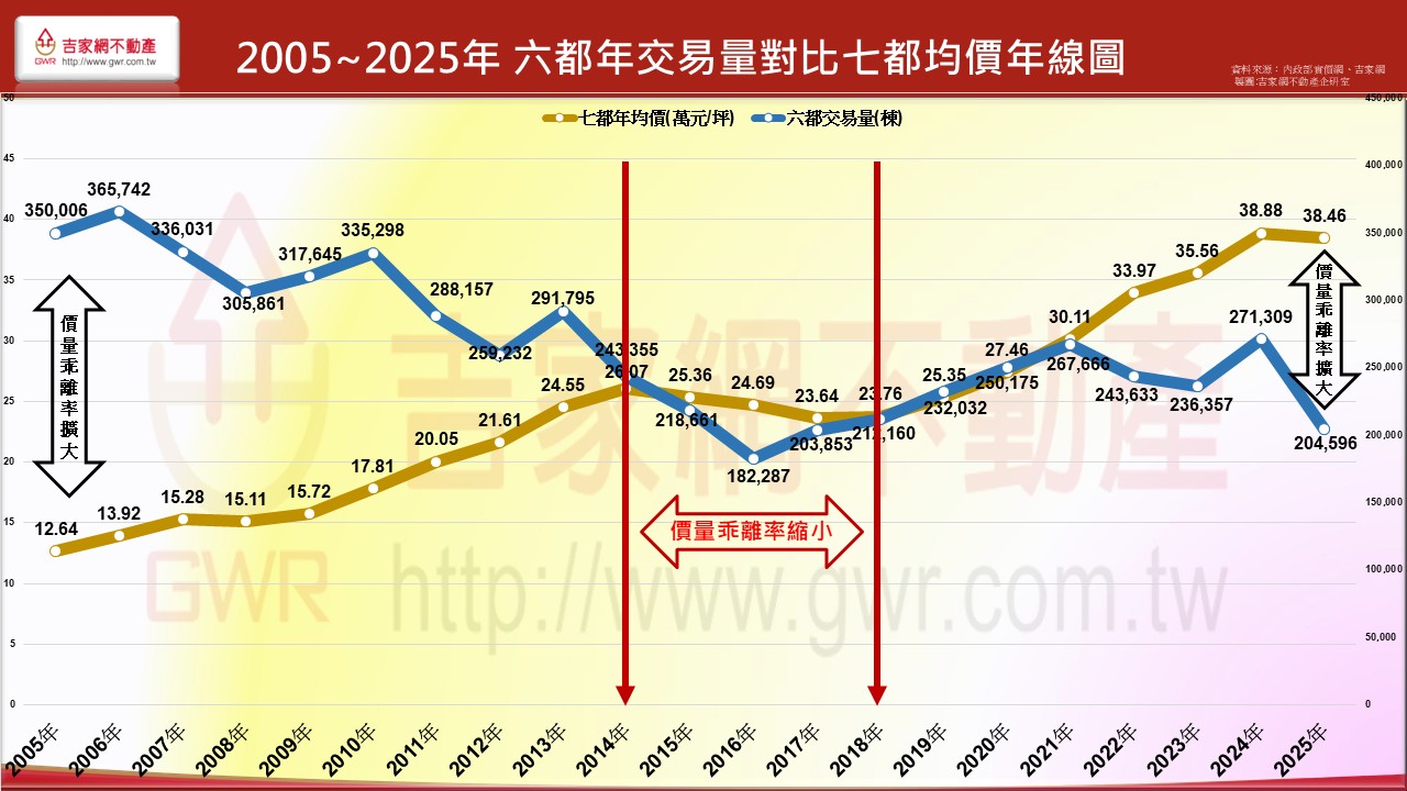 吉家網公布2025年房市年報,房市由多轉空,預售與成屋交易量雙縮急凍,創近十年新低,七都房價高檔反轉下跌4.75%,經濟強勁增長8.86%減緩下跌速度,交屋潮遞增掩蓋實質下跌幅度,股市房市表現脫鉤,K型經濟拉大貧富差距不利剛需,開工量、建照量同步使照量呈死亡交叉,地緣政治緊張影響購屋信心,整體房市呈現「價小跌、量急凍」現象。吉家網董事長李同榮並針對2026房市提出六大觀察指標。