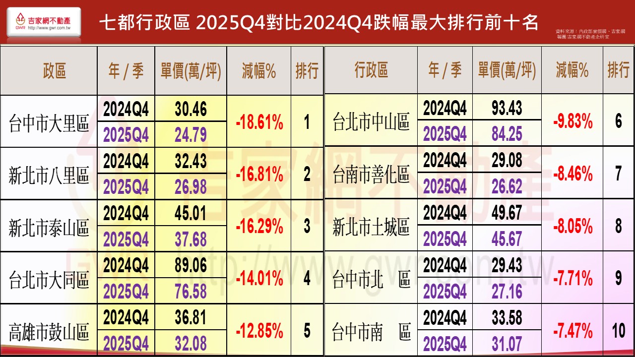 七都各行政區房價2025年比較2024年跌幅前十名依次為:台中市大里區,新北市八里區、泰山區,台北市大同區,高雄市鼓山區,台北市中山區,台南市善化區,新北市土城區,台中市北區、南區。