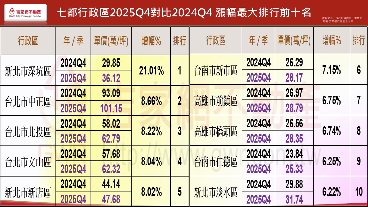 七都各行政區房價2025年比較2024年漲幅前十名依次為:新北市深坑區、台北市中正區、北投區、文山區,新北市新店區、台南市新市區、高雄市前鎭區、橋頭區,台南市仁德區、新北市淡水區。