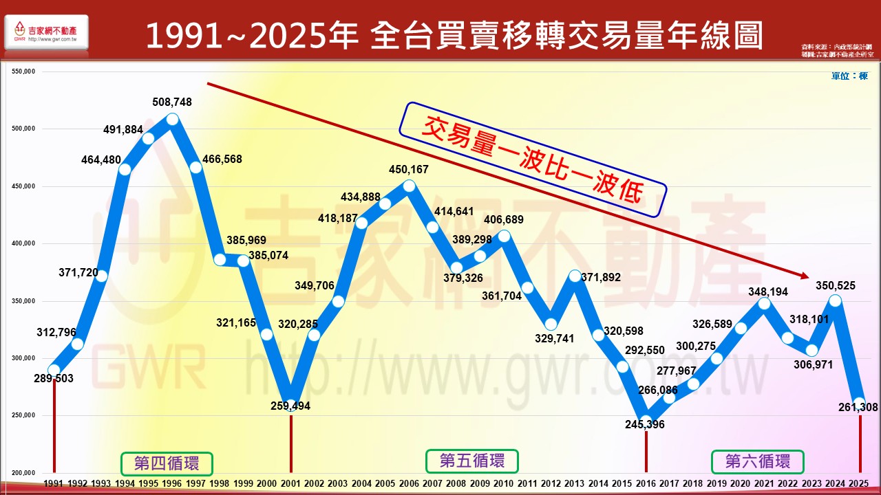 (一) 交易量表現,預售與成屋雙縮急凍,創近十年新低:2025全年成屋交易量26萬1308棟,創自2016年24萬5396棟以來最低量。交易量也呈現一波循環比一波低的困境。