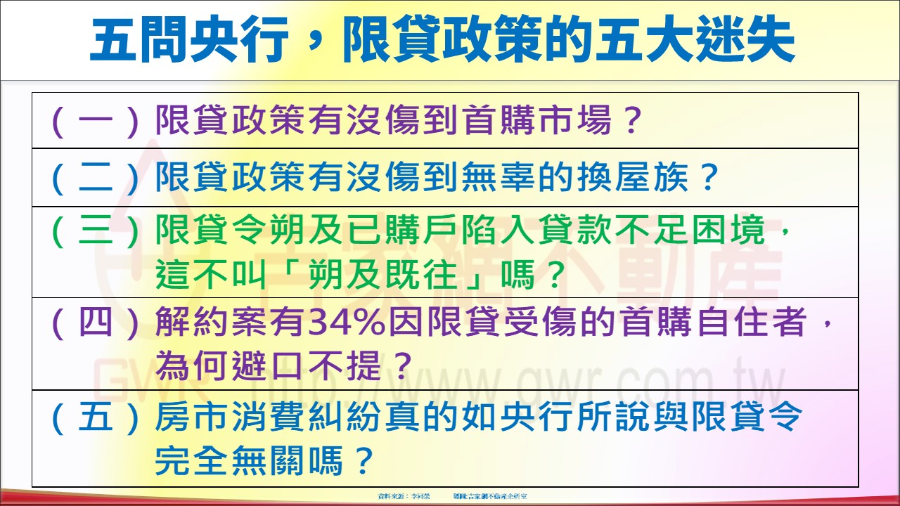 房市趨勢專家李同榮直批:限貸政策引發搶貸亂象叢生,民怨沸騰,央行提出是是而非數據與論述,把責任推的一乾二淨,才真的是在誤導民眾,殊不知限貸政策引發房市糾紛風暴正在延燒,官員不該坐視不管、粉飾太平。他並舉出央行限貸政策的五大迷失,逐一反駁央行理事會的錯誤解讀。