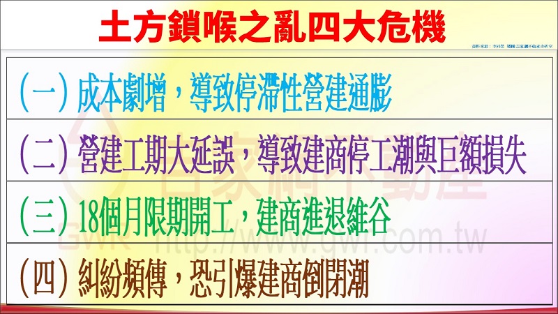 (四)糾紛頻傳,停工潮恐演變為建商倒閉潮:致於前述工期延誤,就會影響完工期,這是未來的未爆彈,但眼前都更個案就馬上牽涉到拆遷工程延誤與未來租金補貼期的延長問題。而更嚴重的問題是,本來預見市場銷售率欠佳就一直延期推案與開工的小建商,在市場不佳、缺工、與土方處理成本不斷增加的壓力下,認為無利可圖,很可能順勢倒閉,建商停工潮就會在連鎖效應下,進而演變為倒閉潮。