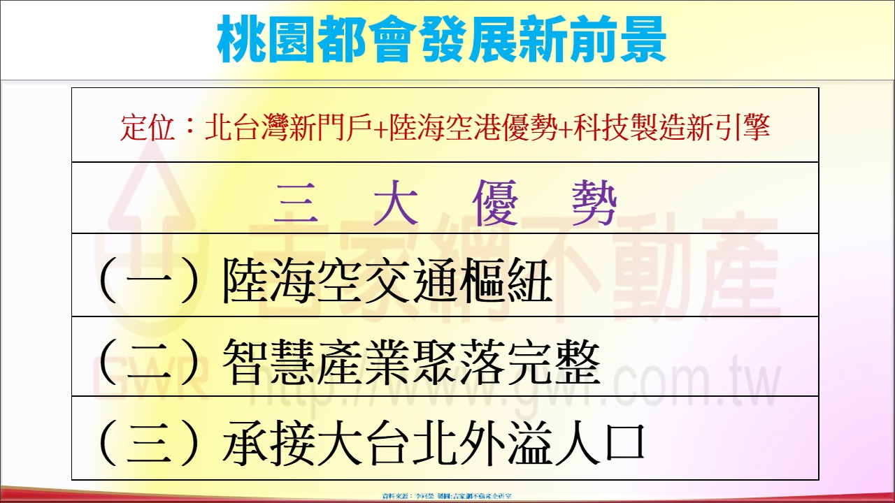 3/承接大台北外溢人口:桃園與台北只有一小時生活圈,且房價差距2.5倍的大環境下,科技新貴、雙北首購與換屋族群,置產與投資需求皆紛紛往桃園都會移動。