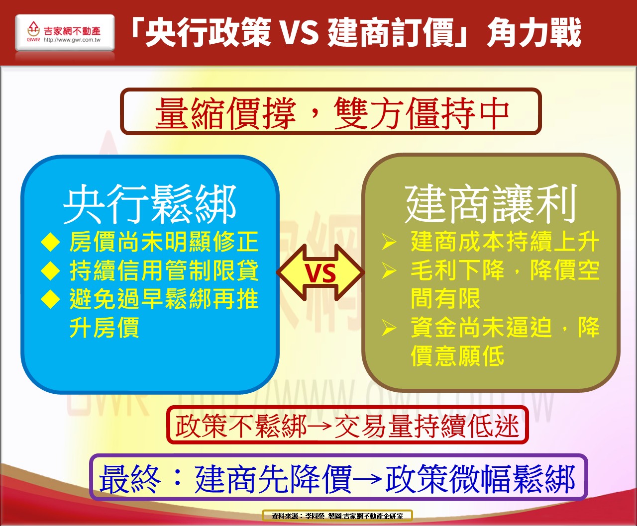 李同榮指出,目前央行政策是否鬆綁與建商是否讓利降價正處於一場難有退路的對峙,央行總裁楊金龍曾明確表示:「建商讓利,量就會出來。」,言外之意,房價若未明顯鬆動,政策很難大幅鬆綁。從目前市場現況觀察,價格未見鬆動,交易量未見明顯回溫,顯示雙方仍在僵持中。